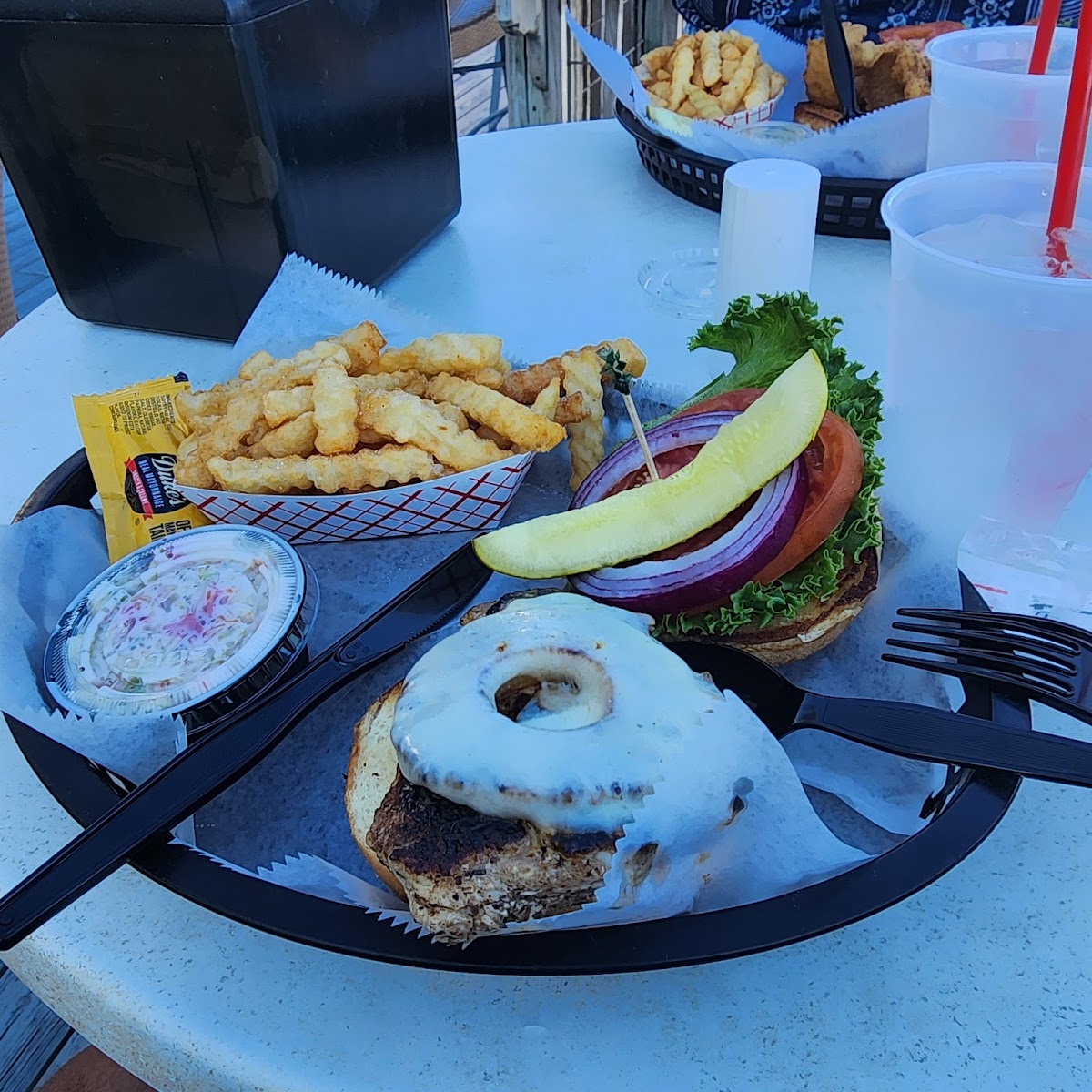 Excellent lunch — twice! Jerk chicken is a standout. Chef substituted it into the tacos, it was delicious. Salad was big and fresh, with toasted sunflower seeds for extra flavor. My husband had the fish sandwich both times, it was on hero sized bread and the fries were crispy and salty. Great service both times, lovely outdoor deck.
