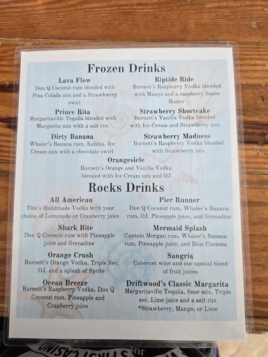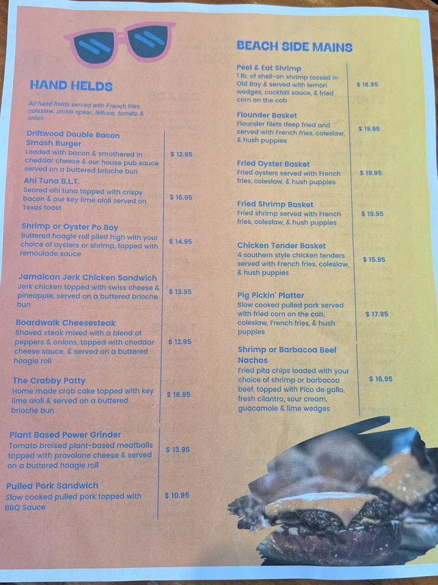 The menu at Boardwalk Beach Cafe offers a relaxed and approachable selection of bar and grill favorites, perfect for casual dining by the ocean. Expect comforting, straightforward dishes like a Double Bacon Burger or a Jerk Chicken Sandwich that pair well with a chilled Margarita or one of their signature frozen and blended drinks such as the Lava Flow or Dirty Banana.
